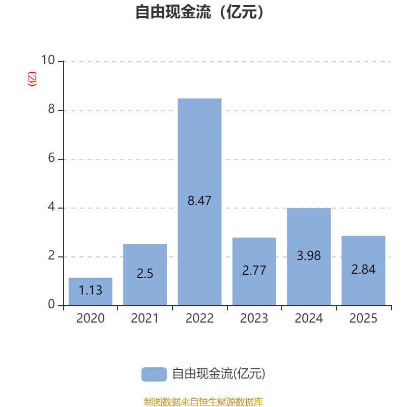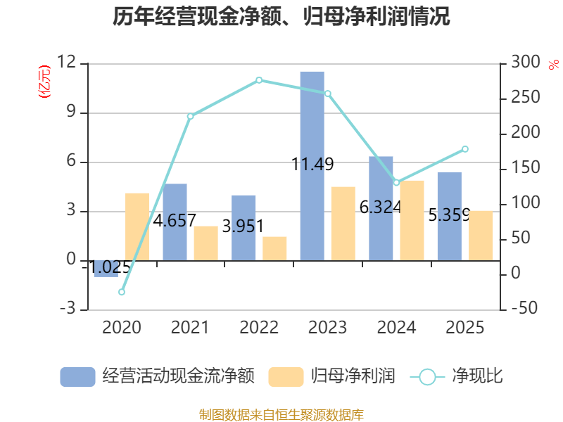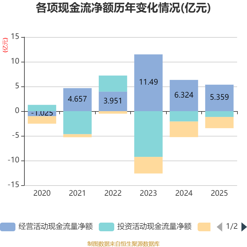 截至2025年,公司经营活动现金流净额为5.36亿元,同比下降15.26%;筹资活动现金流净额-2.27亿元,同比增加8922.28万元;投资活动现金流净额-1.18亿元,上年同期为-2.1亿元。