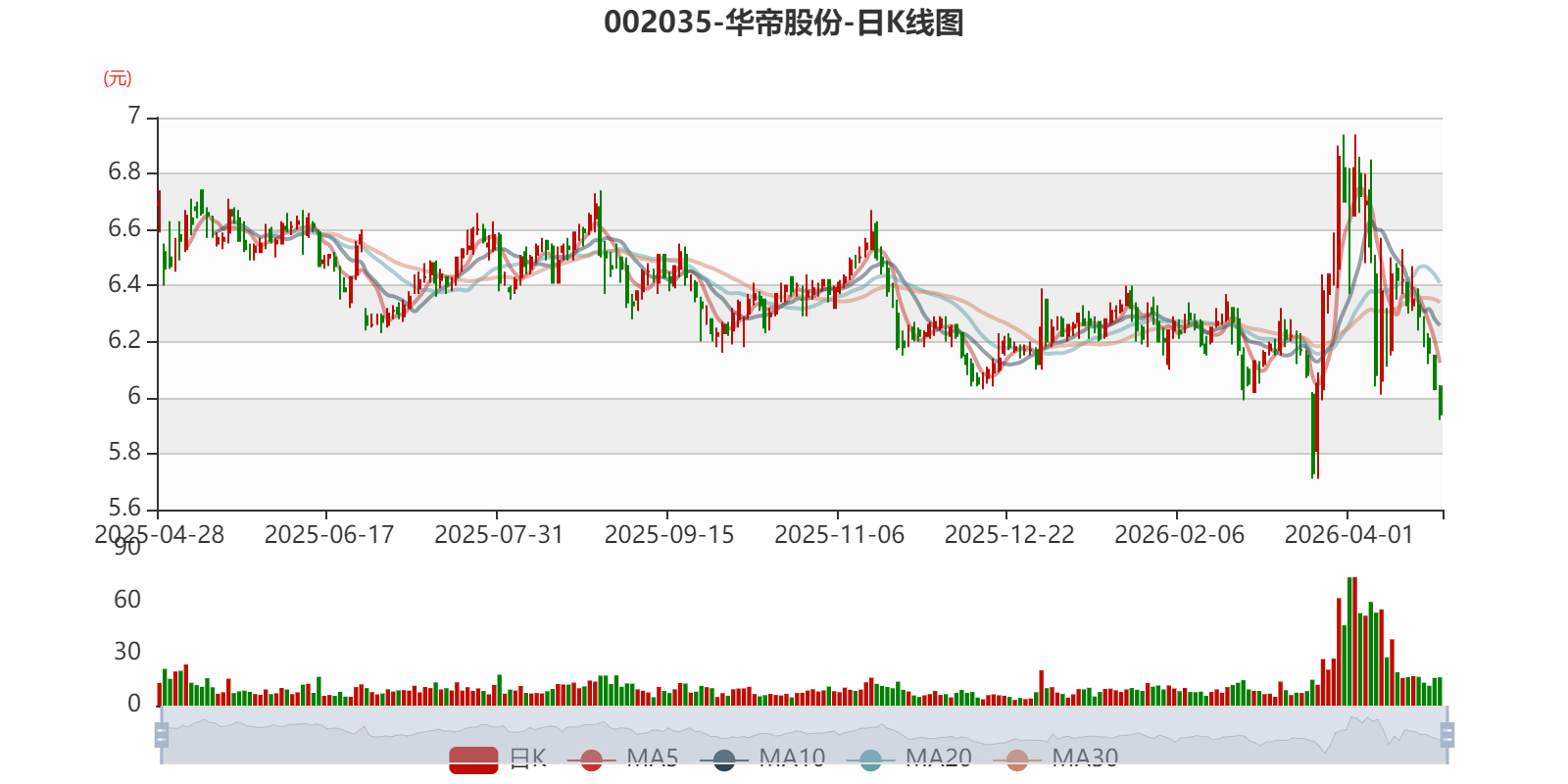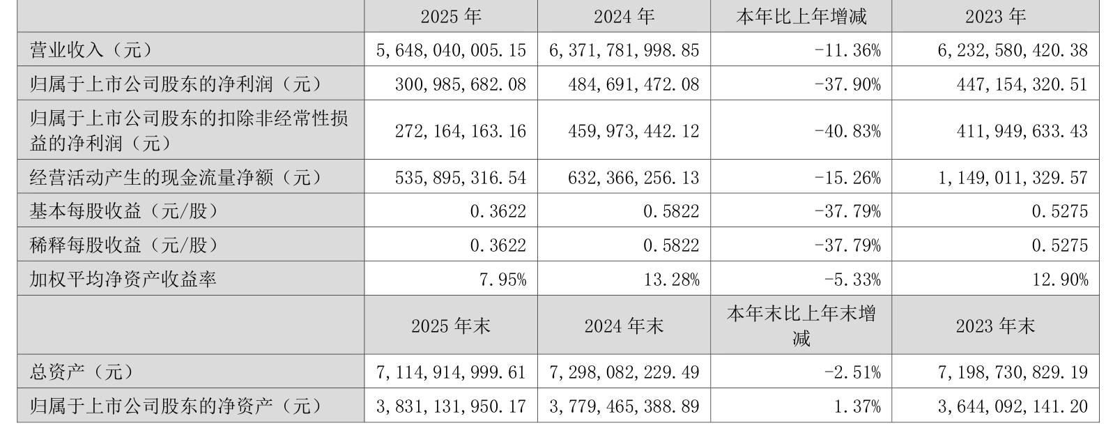 中证智能财讯华帝股份(002035)4月28日披露2025年年度报告。2025年,公司实现营业总收入56.48亿元,同比下降11.36%;归母净利润3.01亿元,同比下降37.90%;扣非净利润2.72亿元,同比下降40.83%;经营活动产生的现金流量净额为5.36亿元,同比下降15.26%;报告期内,华帝股份基本每股收益为0.3622元,加权平均净资产收益率为7.95%。公司2025年度分配预案为:拟向全体股东每10股派现1元(含税)。