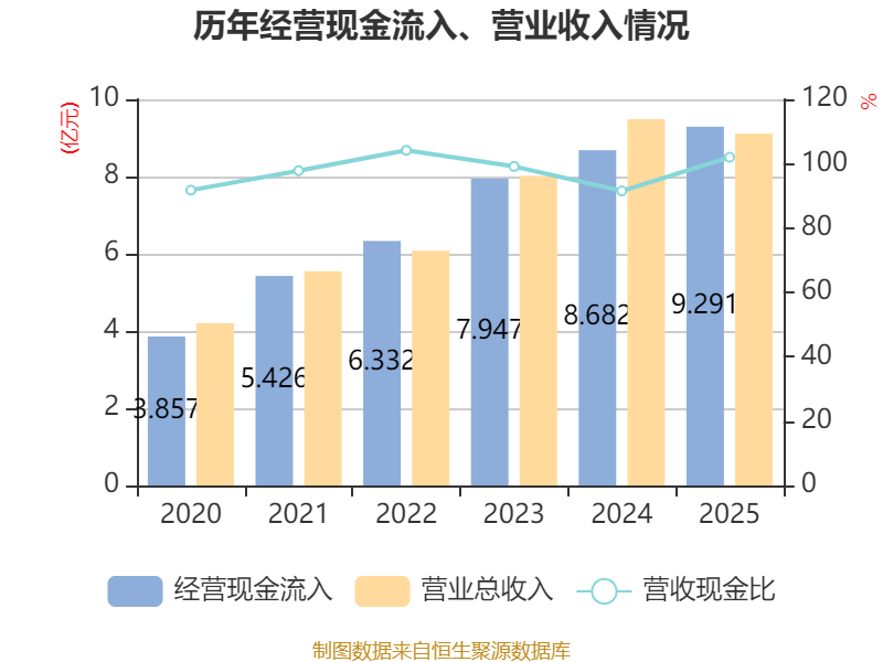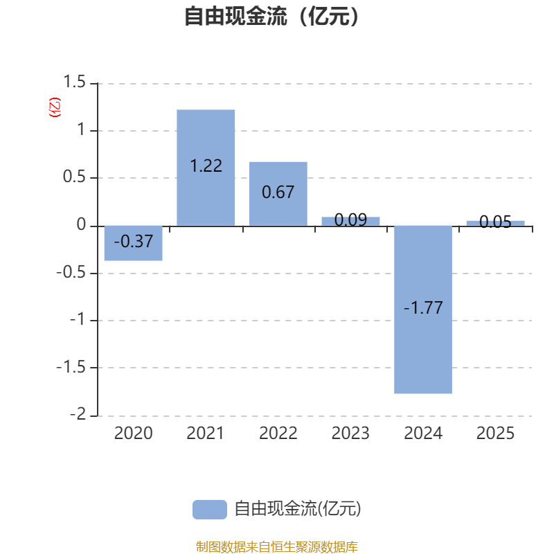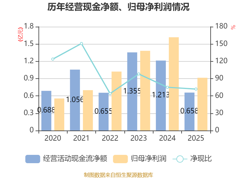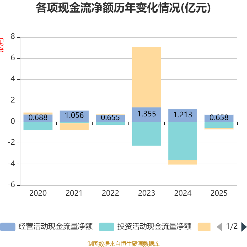 截至2025年,公司经营活动现金流净额为6580.96万元,同比下降45.75%;筹资活动现金流净额-1390.81万元,同比增加2711.11万元;投资活动现金流净额-5865.31万元,上年同期为-3.63亿元。