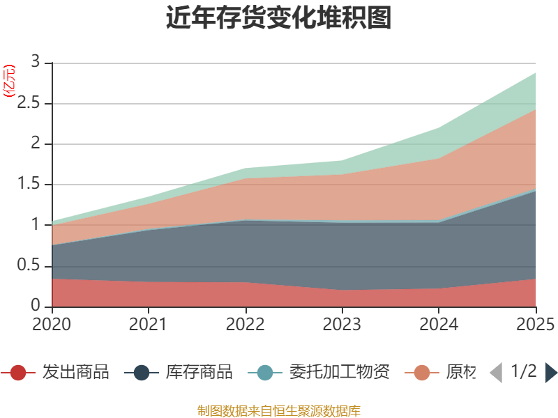 从存货变动来看,截至2025年末,公司存货账面价值为2.88亿元,占净资产的22.96%,较上年末增加6779.08万元。其中,存货跌价准备为1581.92万元,计提比例为5.21%。