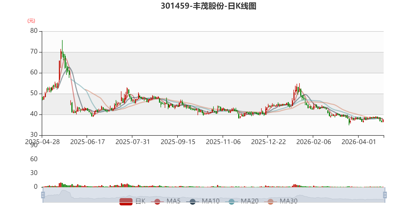 以4月27日收盘价计算,丰茂股份目前市盈率(TTM)约为42.61倍,市净率(LF)约3.11倍,市销率(TTM)约4.28倍。