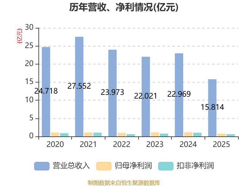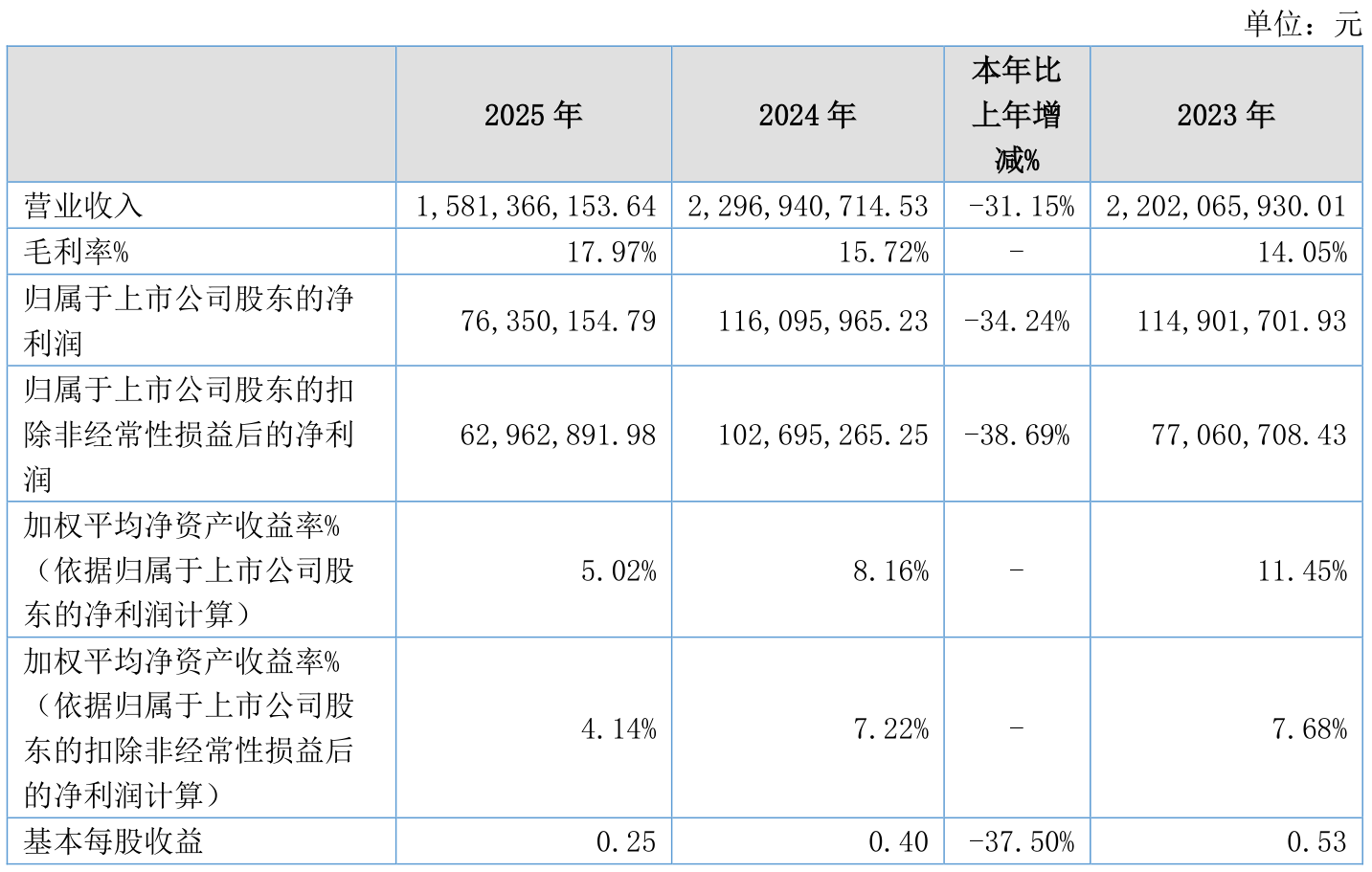 中证智能财讯云星宇(920806)4月27日披露2025年年度报告。2025年,公司实现营业总收入15.81亿元,同比下降31.15%;归母净利润7635.02万元,同比下降34.24%;扣非净利润6296.29万元,同比下降38.69%;经营活动产生的现金流量净额为5.83亿元,上年同期为-7163.08万元;报告期内,云星宇基本每股收益为0.25元,加权平均净资产收益率为5.02%。公司2025年度分配预案为:拟向全体股东每10股派现1元(含税)。