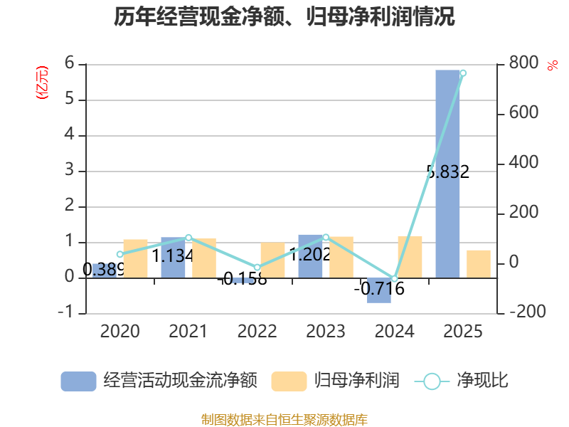截至2025年,公司经营活动现金流净额为5.83亿元,同比增加6.55亿元;筹资活动现金流净额-4379.95万元,同比减少3.52亿元;投资活动现金流净额5750.66万元,上年同期为-6915.55万元。