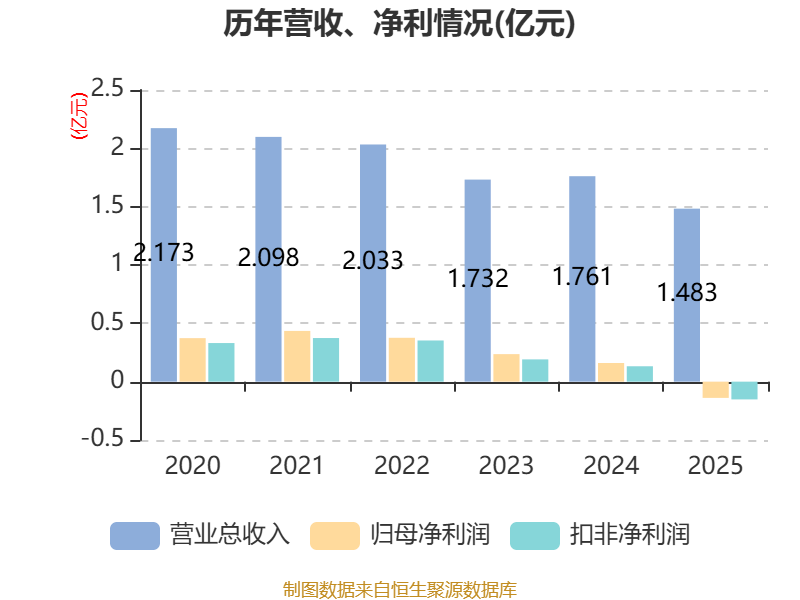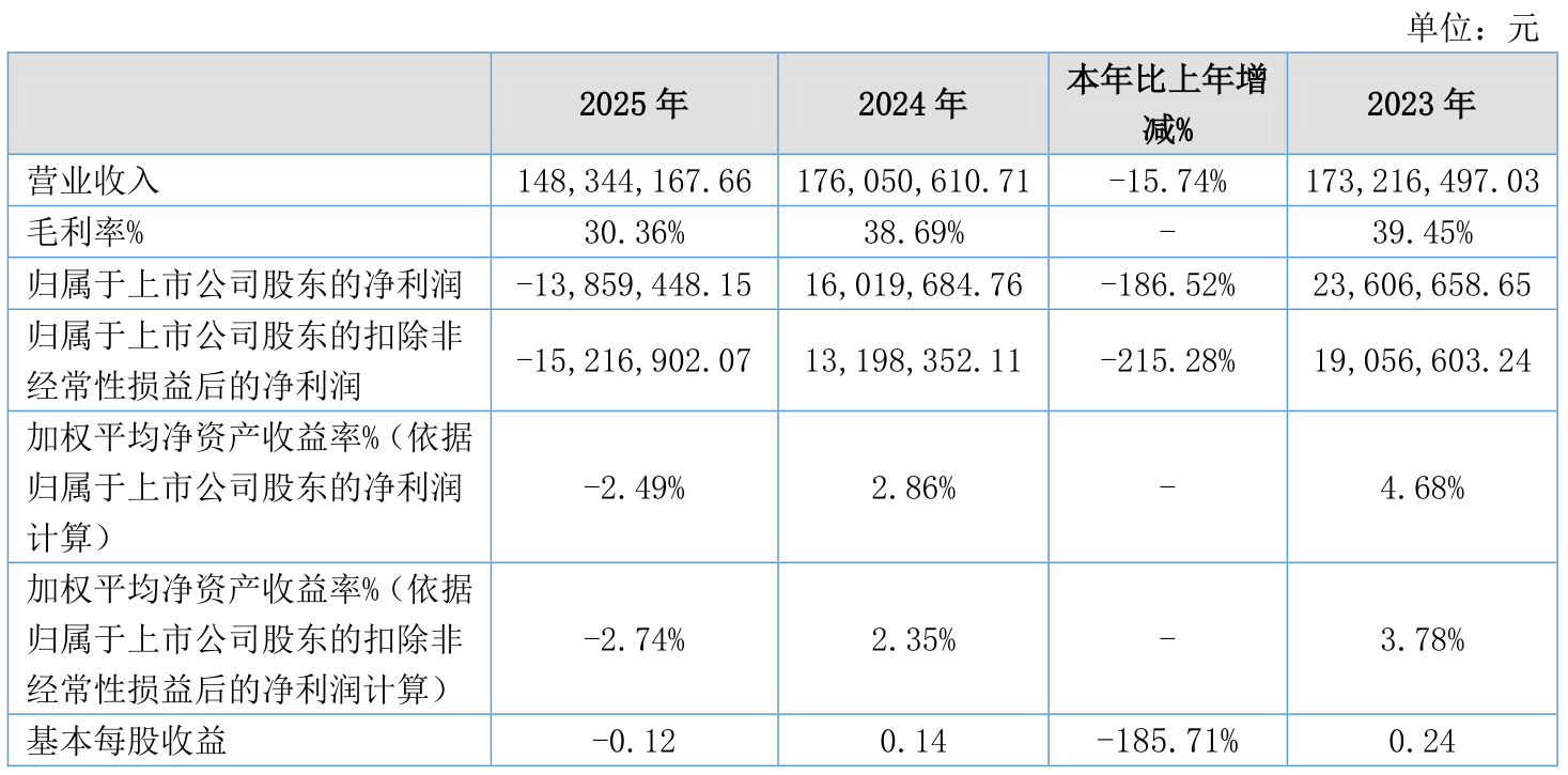中证智能财讯瑞星股份(920717)4月27日披露2025年年度报告。2025年,公司实现营业总收入1.48亿元,同比下降15.74%;归母净利润亏损1385.94万元,上年同期盈利1601.97万元;扣非净利润亏损1521.69万元,上年同期盈利1319.84万元;经营活动产生的现金流量净额为3177.92万元,同比增长127.59%;报告期内,瑞星股份基本每股收益为-0.12元,加权平均净资产收益率为-2.49%。