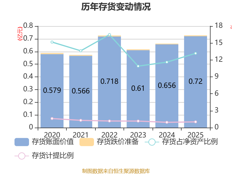 从存货变动来看,截至2025年末,公司存货账面价值为7202.94万元,占净资产的13.17%,较上年末增加640.26万元。其中,存货跌价准备为74.58万元,计提比例为1.02%。