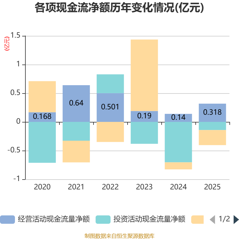 截至2025年,公司经营活动现金流净额为3177.92万元,同比增长127.59%;筹资活动现金流净额-2630.65万元,同比减少1398.39万元;投资活动现金流净额-1420.37万元,上年同期为-7047.44万元。