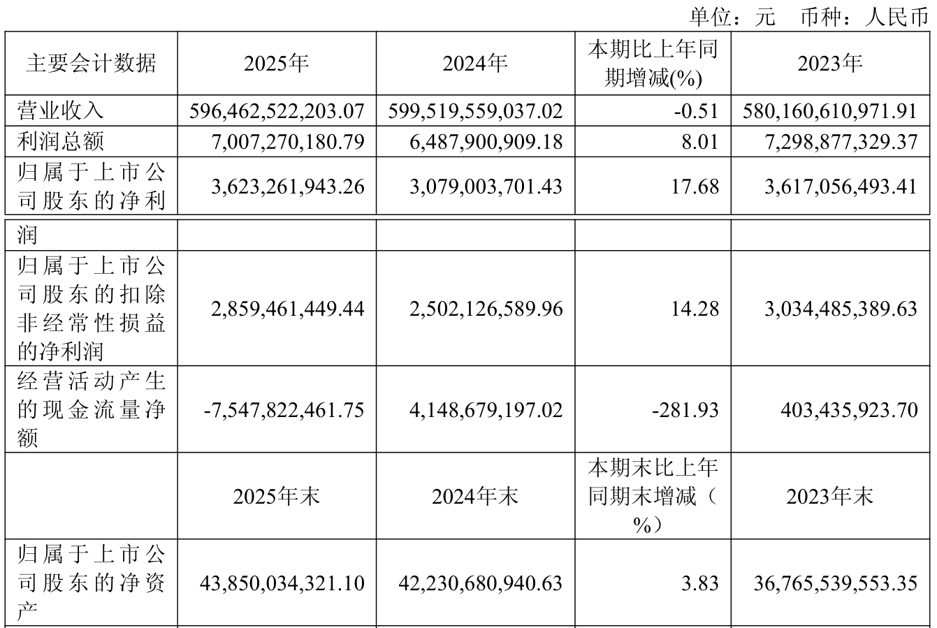 中证智能财讯物产中大(600704)4月28日披露2025年年度报告。2025年,公司实现营业总收入5964.63亿元,同比下降0.51%;归母净利润36.23亿元,同比增长17.68%;扣非净利润28.59亿元,同比增长14.28%;经营活动产生的现金流量净额为-75.48亿元,上年同期为41.49亿元;报告期内,物产中大基本每股收益为0.69元,加权平均净资产收益率为8.70%。公司2025年度分配预案为:拟向全体股东每10股派现1.2元(含税)。