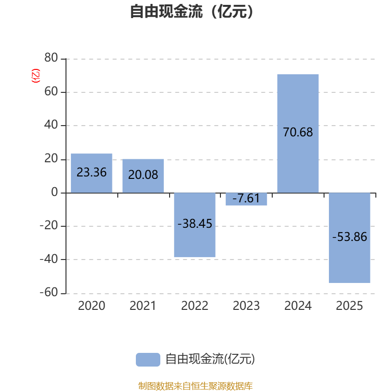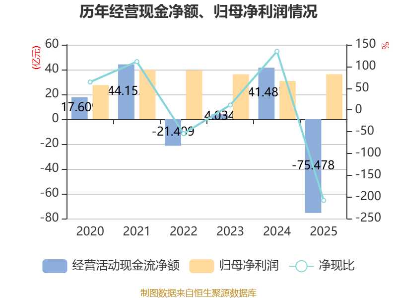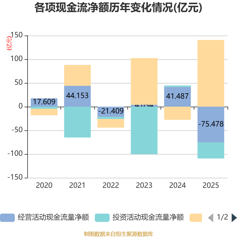 截至2025年,公司经营活动现金流净额为-75.48亿元,同比减少116.97亿元;筹资活动现金流净额140.75亿元,同比增加168.51亿元;投资活动现金流净额-33.9亿元,上年同期为3.1亿元。
