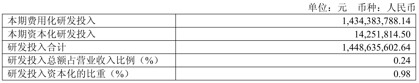 2025年全年,公司研发投入金额为14.49亿元,同比增长15.53%;研发投入占营业收入比例为0.24%,相比上年同期上升0.03个百分点。此外,公司全年研发投入资本化率为0.98%。