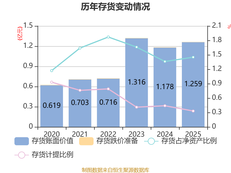 从存货变动来看,截至2025年末,公司存货账面价值为1.26亿元,占净资产的1.45%,较上年末增加803.99万元。其中,存货跌价准备为41.72万元,计提比例为0.33%。