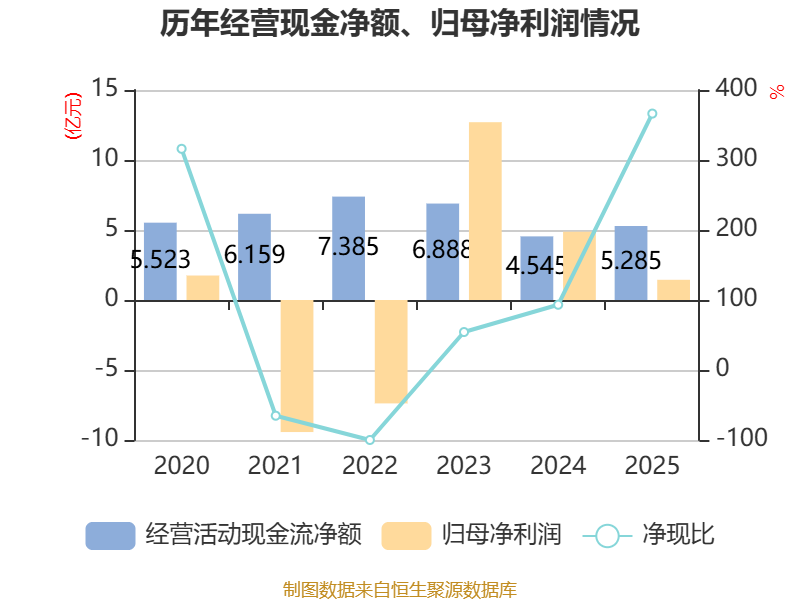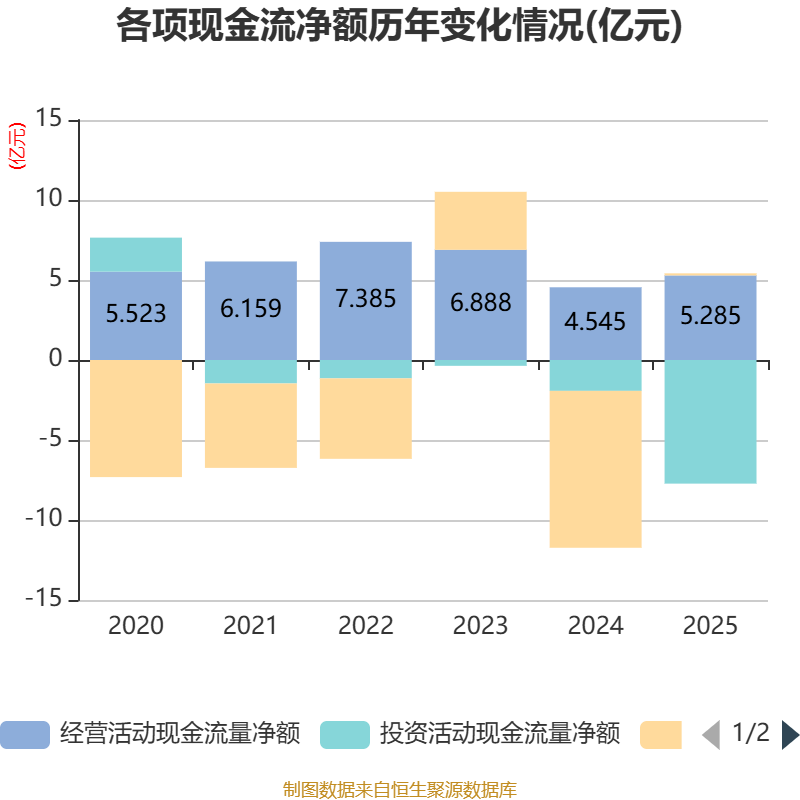 截至2025年,公司经营活动现金流净额为5.28亿元,同比增长16.26%;筹资活动现金流净额1320.81万元,同比增加9.94亿元;投资活动现金流净额-7.73亿元,上年同期为-1.93亿元。