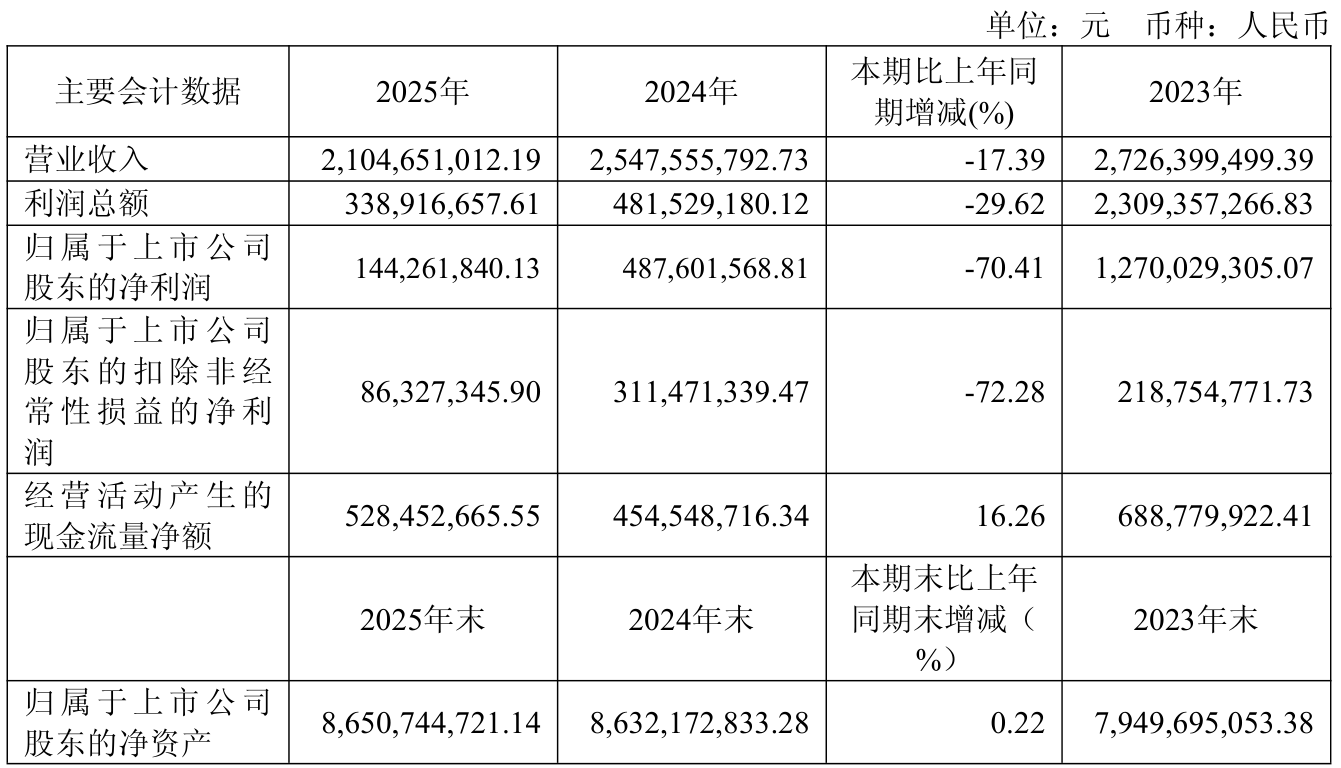 中证智能财讯洲际油气(600759)4月28日披露2025年年度报告。2025年,公司实现营业总收入21.05亿元,同比下降17.39%;归母净利润1.44亿元,同比下降70.41%;扣非净利润8632.73万元,同比下降72.28%;经营活动产生的现金流量净额为5.28亿元,同比增长16.26%;报告期内,洲际油气基本每股收益为0.0365元,加权平均净资产收益率为1.66%。