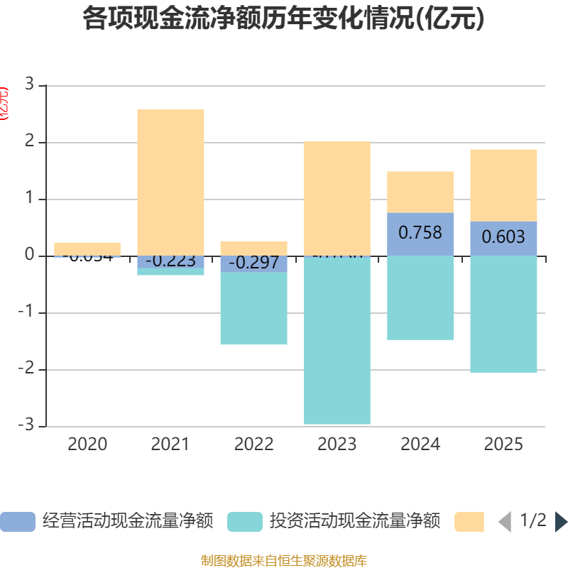 截至2025年,公司经营活动现金流净额为6034.82万元,同比下降20.42%;筹资活动现金流净额1.26亿元,同比增加5401.59万元;投资活动现金流净额-2.06亿元,上年同期为-1.49亿元。