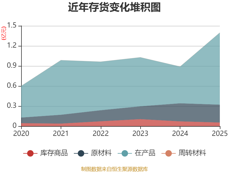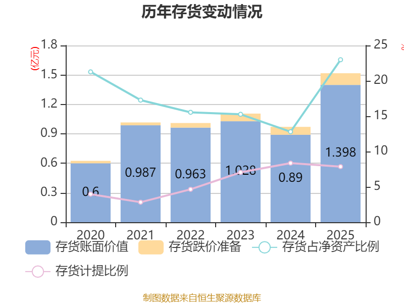 从存货变动来看,截至2025年末,公司存货账面价值为1.4亿元,占净资产的22.98%,较上年末增加5079.17万元。其中,存货跌价准备为1192.31万元,计提比例为7.86%。