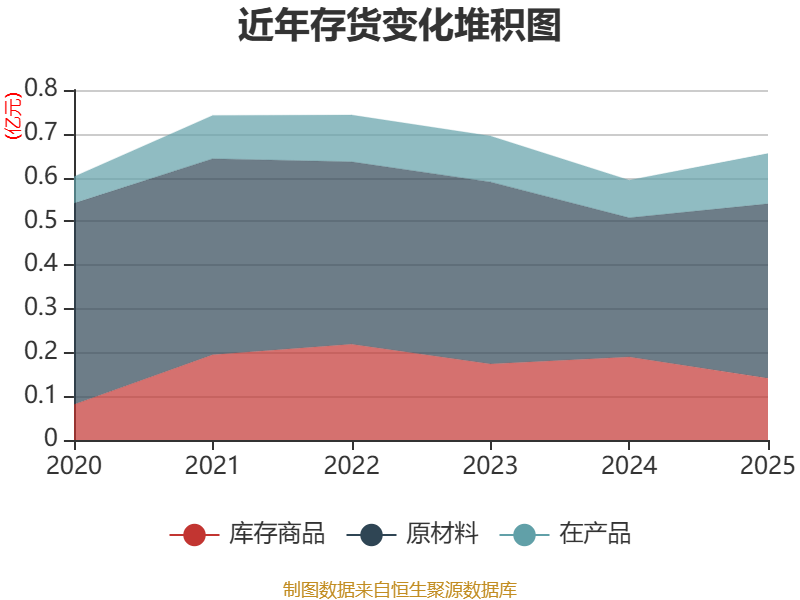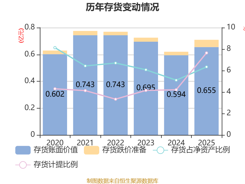 从存货变动来看,截至2025年末,公司存货账面价值为6554.86万元,占净资产的6.34%,较上年末增加614.99万元。其中,存货跌价准备为542万元,计提比例为7.64%。