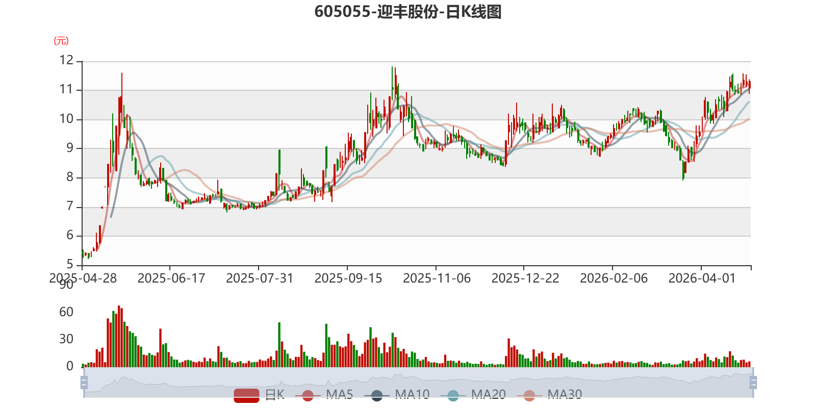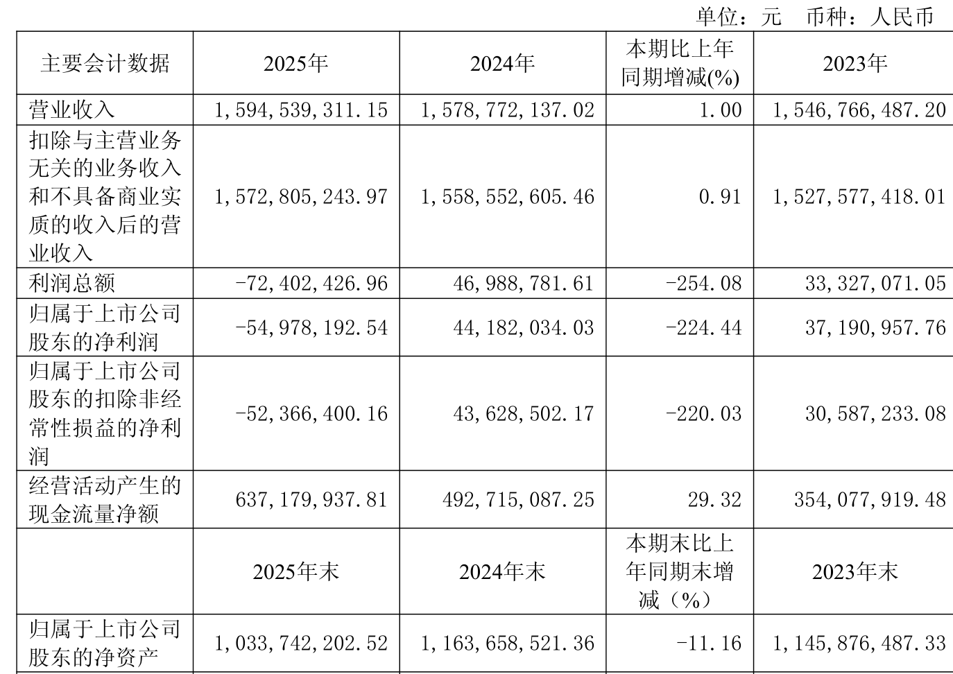 中证智能财讯迎丰股份(605055)4月28日披露2025年年度报告。2025年,公司实现营业总收入15.95亿元,同比增长1.00%;归母净利润亏损5497.82万元,上年同期盈利4418.2万元;扣非净利润亏损5236.64万元,上年同期盈利4362.85万元;经营活动产生的现金流量净额为6.37亿元,同比增长29.32%;报告期内,迎丰股份基本每股收益为-0.13元,加权平均净资产收益率为-4.99%。公司2025年度分配预案为:拟向全体股东每10股派现0.6元(含税)。