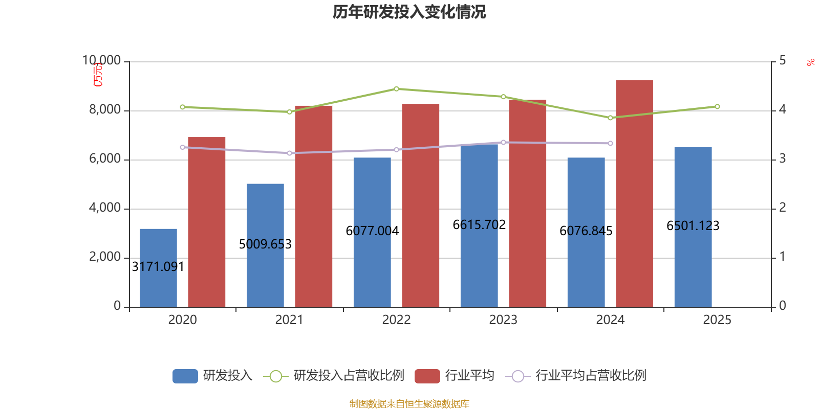 2025年全年,公司研发投入金额为6501.12万元,同比增长6.98%;研发投入占营业收入比例为4.08%,相比上年同期上升0.23个百分点。