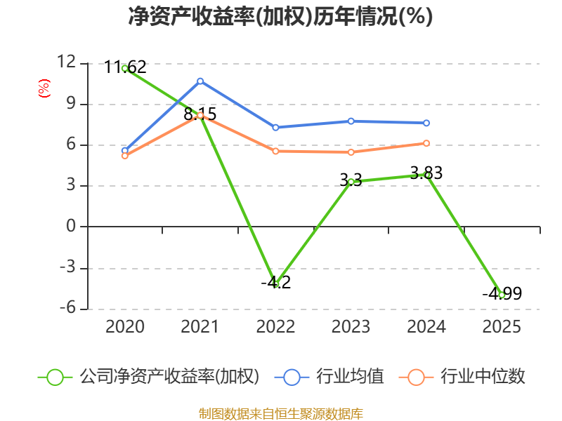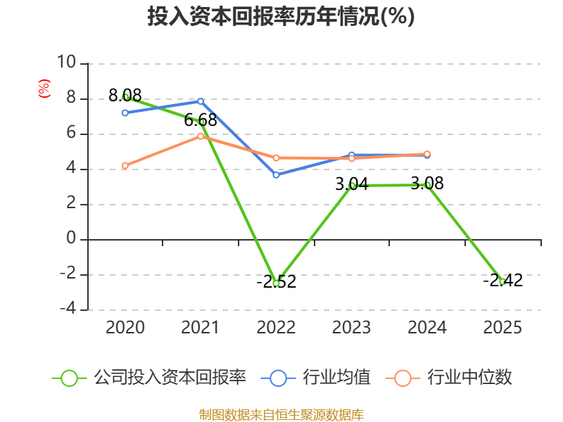 数据显示,2025年公司加权平均净资产收益率为-4.99%,较上年同期下降8.82个百分点。公司2025年投入资本回报率为-2.42%,较上年同期下降5.5个百分点。