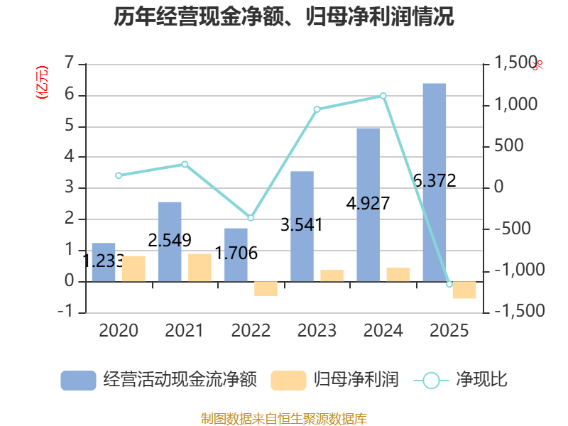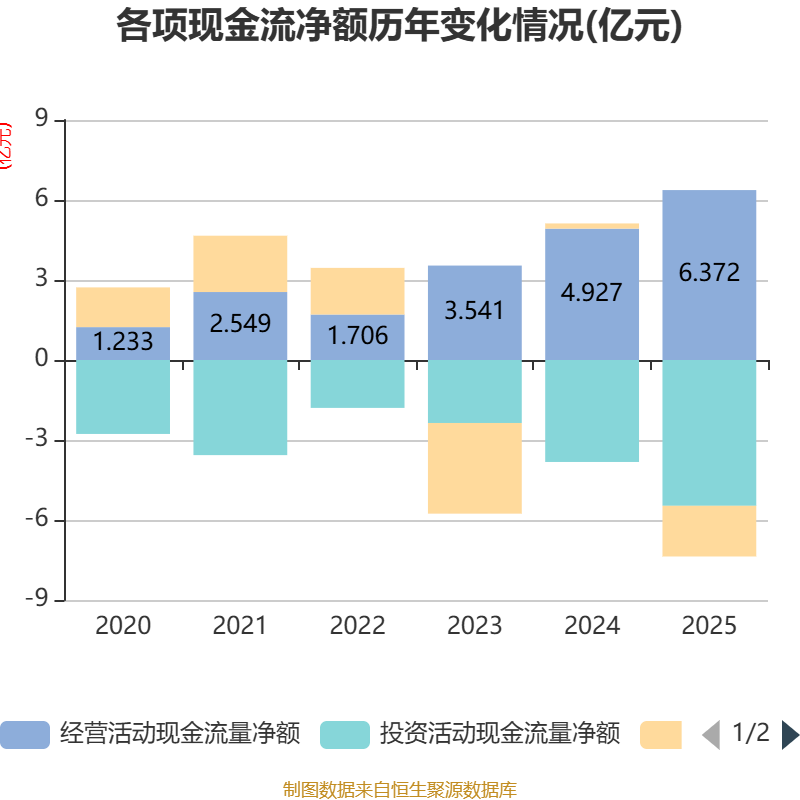 截至2025年,公司经营活动现金流净额为6.37亿元,同比增长29.32%;筹资活动现金流净额-1.9亿元,同比减少2.09亿元;投资活动现金流净额-5.47亿元,上年同期为-3.82亿元。