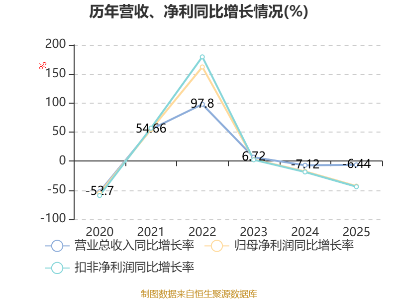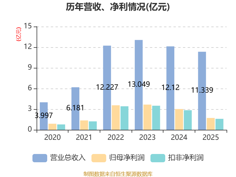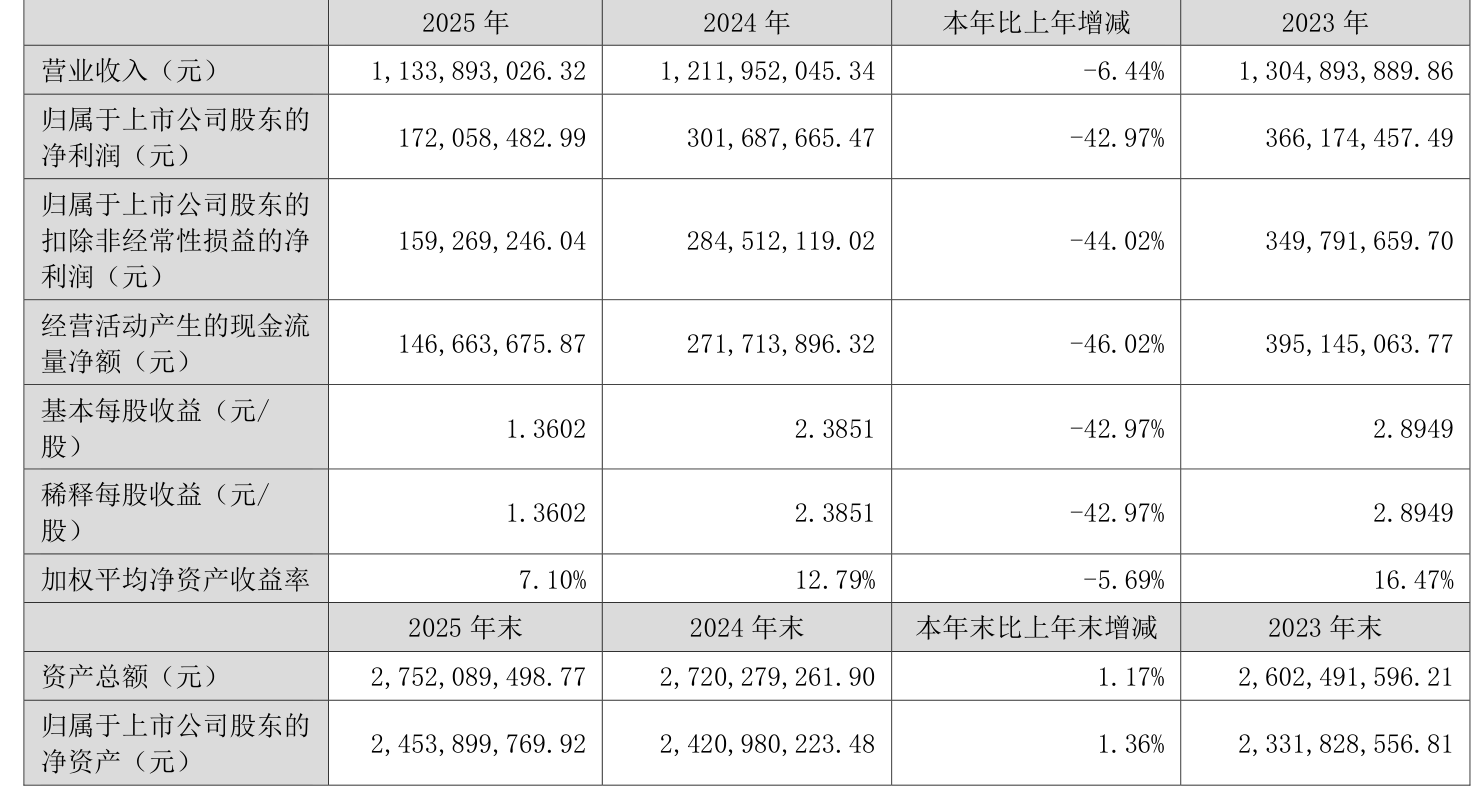中证智能财讯浩洋股份(300833)4月28日披露2025年年度报告。2025年,公司实现营业总收入11.34亿元,同比下降6.44%;归母净利润1.72亿元,同比下降42.97%;扣非净利润1.59亿元,同比下降44.02%;经营活动产生的现金流量净额为1.47亿元,同比下降46.02%;报告期内,浩洋股份基本每股收益为1.3602元,加权平均净资产收益率为7.10%。公司2025年度分配预案为:拟向全体股东每10股派现7元(含税)。