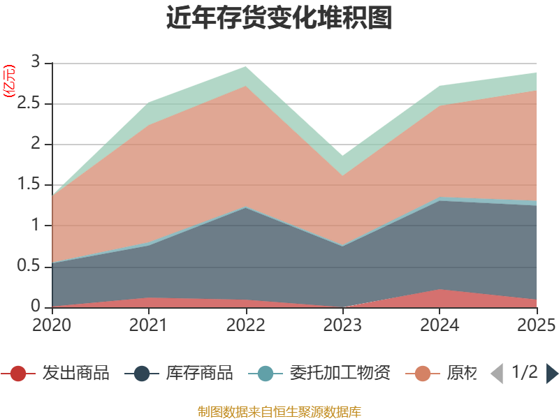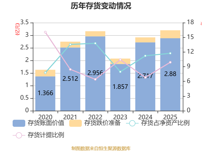 从存货变动来看,截至2025年末,公司存货账面价值为2.88亿元,占净资产的11.74%,较上年末增加1625.92万元。其中,存货跌价准备为3165.98万元,计提比例为9.9%。