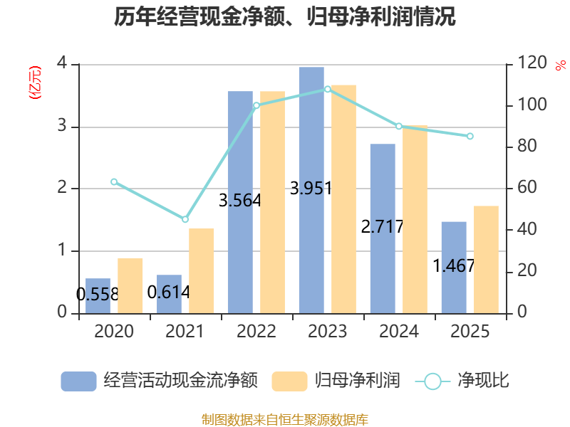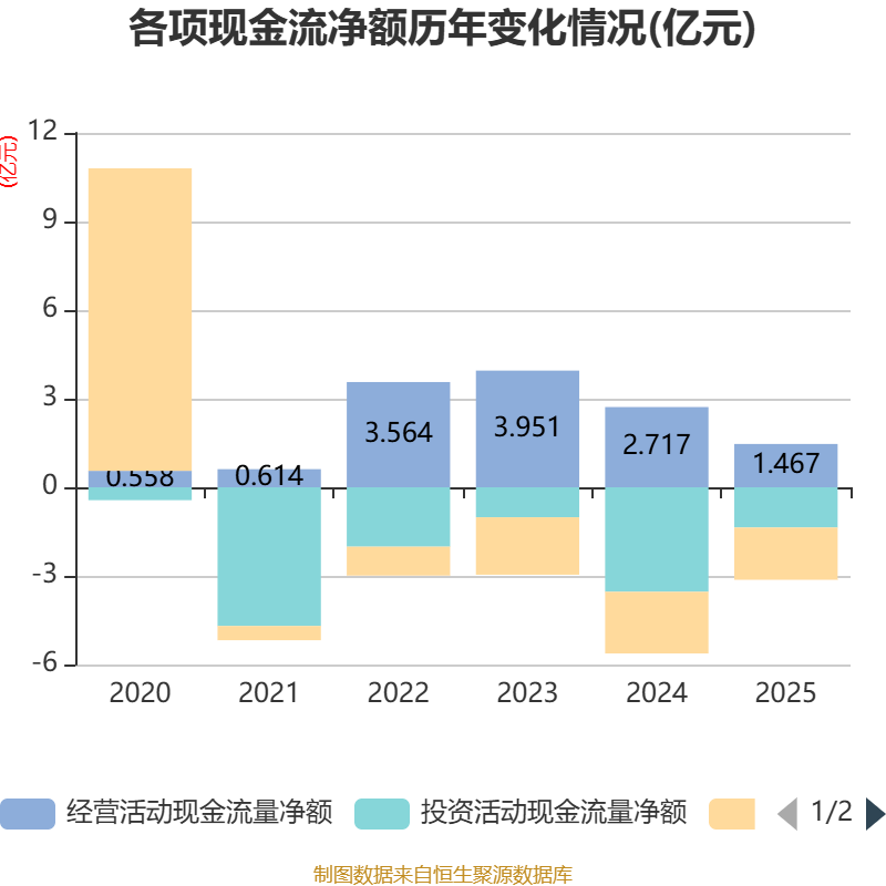 截至2025年,公司经营活动现金流净额为1.47亿元,同比下降46.02%;筹资活动现金流净额-1.77亿元,同比增加3173.52万元;投资活动现金流净额-1.36亿元,上年同期为-3.54亿元。