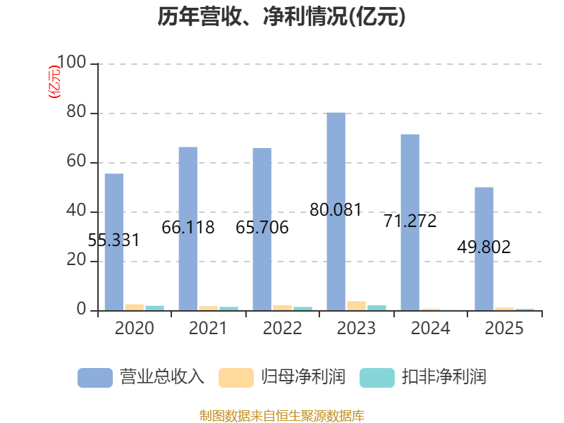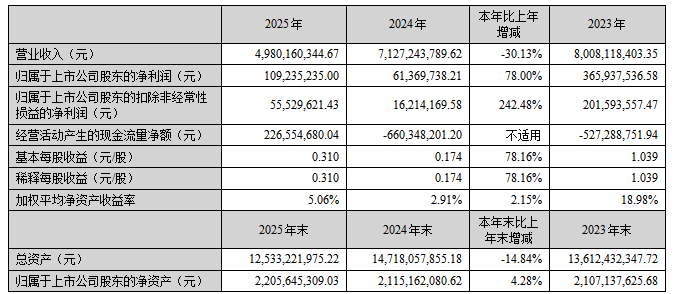 中证智能财讯高新发展(000628)4月28日披露2025年年度报告。2025年,公司实现营业总收入49.8亿元,同比下降30.13%;归母净利润1.09亿元,同比增长78.00%;扣非净利润5552.96万元,同比增长242.48%;经营活动产生的现金流量净额为2.27亿元,上年同期为-6.6亿元;报告期内,高新发展基本每股收益为0.31元,加权平均净资产收益率为5.06%。公司2025年度分配预案为:拟向全体股东每10股派现1元(含税)。