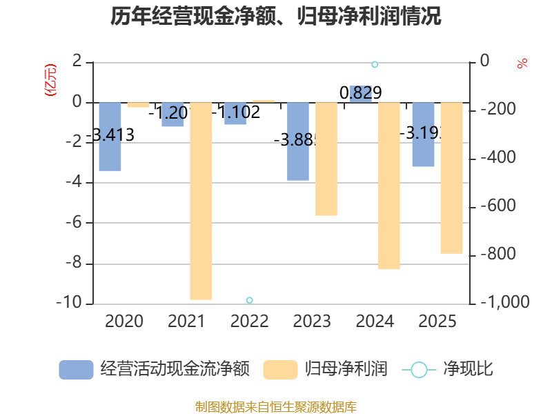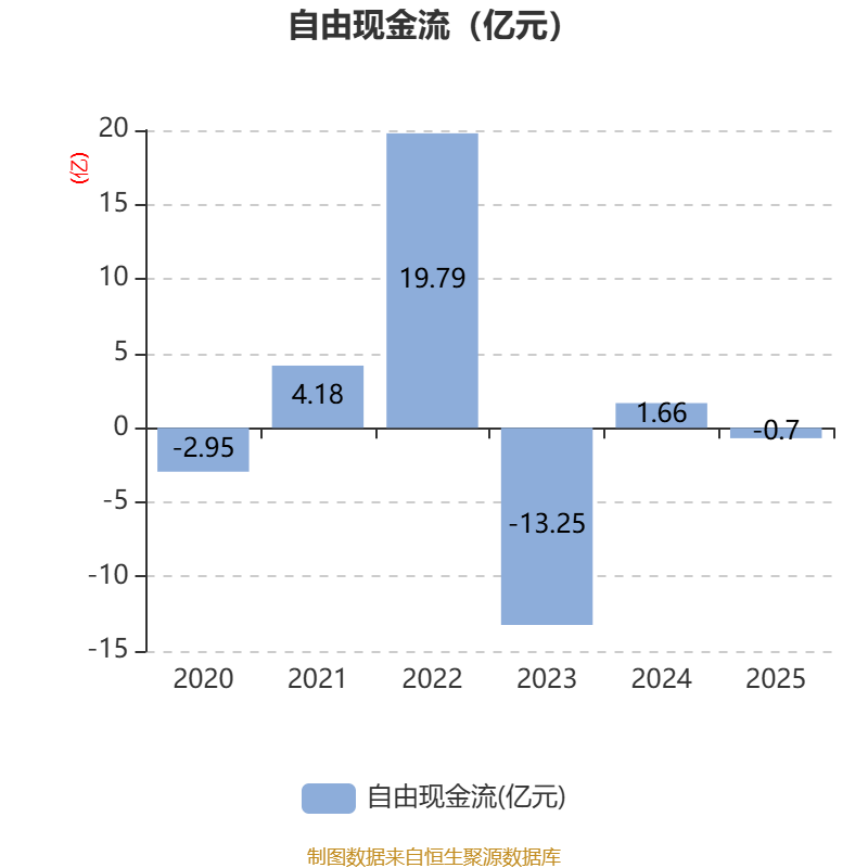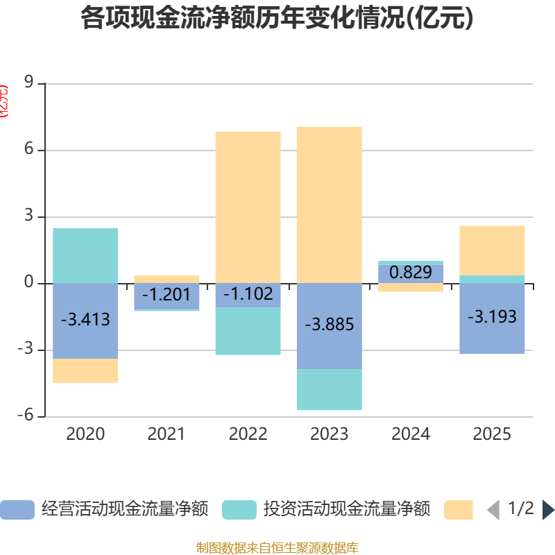 截至2025年,公司经营活动现金流净额为-3.19亿元,同比减少4.02亿元;筹资活动现金流净额2.22亿元,同比增加2.61亿元;投资活动现金流净额3527.66万元,上年同期为1713.08万元。