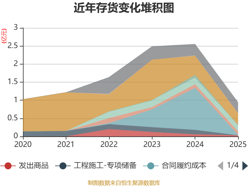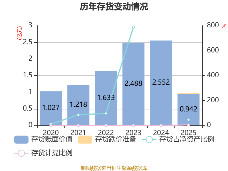 从存货变动来看,截至2025年末,公司存货账面价值为9416.9万元,占净资产的45.75%,较上年末减少1.61亿元。其中,存货跌价准备为372.09万元,计提比例为3.8%。