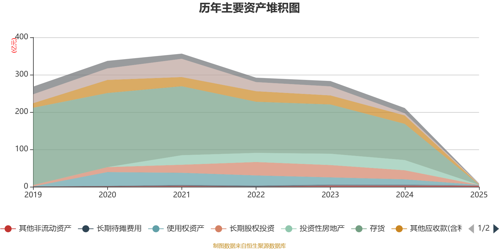 资产重大变化方面,截至2025年末,公司存货较上年末减少99.61%,占公司总资产比重下降41.61个百分点;其他非流动资产较上年末减少0.87%,占公司总资产比重上升29.26个百分点;货币资金较上年末减少71.3%,占公司总资产比重上升16.56个百分点;投资性房地产较上年末减少99.48%,占公司总资产比重下降11.42个百分点。