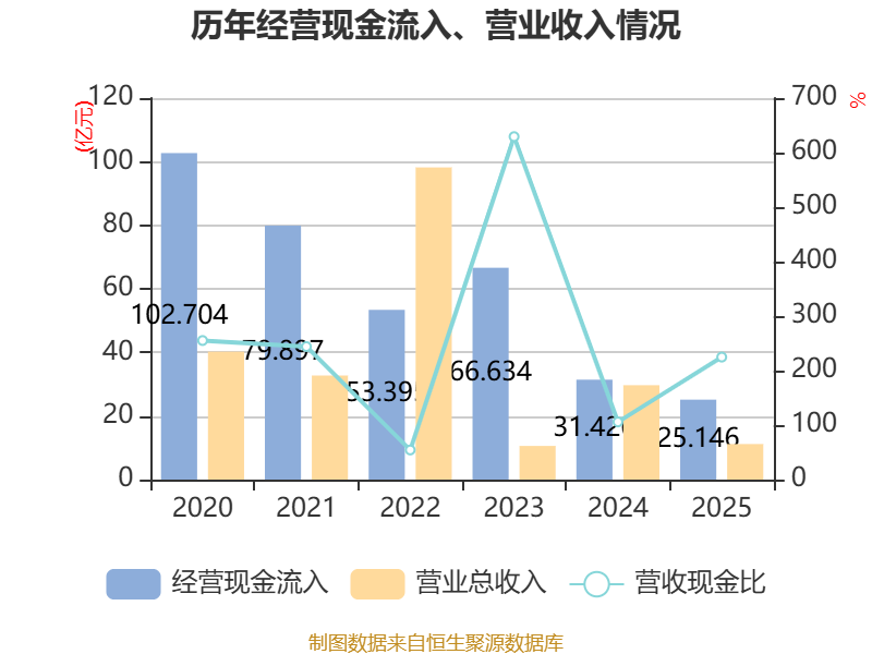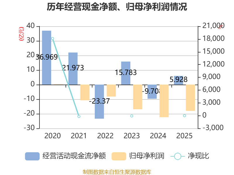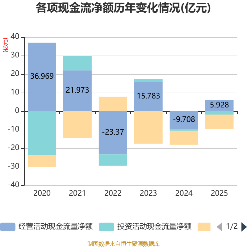 截至2025年,公司经营活动现金流净额为5.93亿元,同比增加15.64亿元;筹资活动现金流净额-7.78亿元,同比减少1883.72万元;投资活动现金流净额-1.84亿元,上年同期为-8438.9万元。