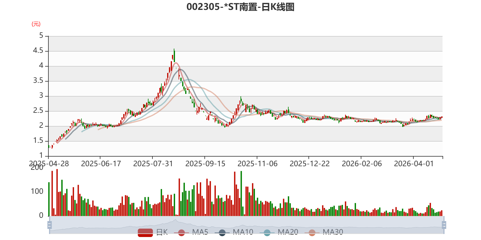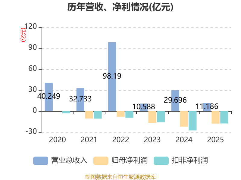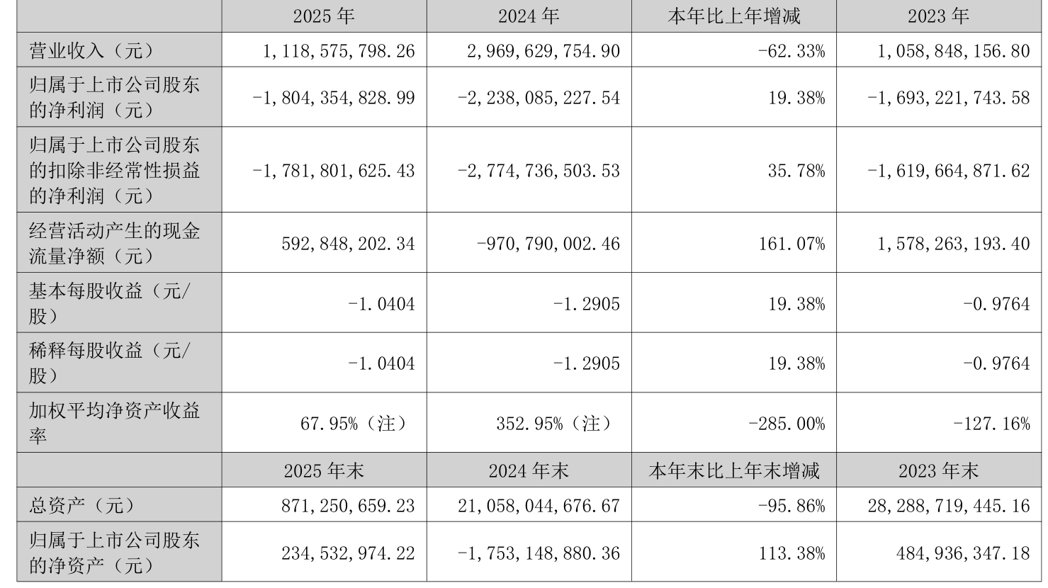 中证智能财讯 *ST南置(002305)4月28日披露2025年年度报告。2025年,公司实现营业总收入11.19亿元,同比下降62.33%;归母净利润亏损18.04亿元,上年同期亏损22.38亿元;扣非净利润亏损17.82亿元,上年同期亏损27.75亿元;经营活动产生的现金流量净额为5.93亿元,上年同期为-9.71亿元;报告期内,*ST南置基本每股收益为-1.0404元,加权平均净资产收益率为67.95%。