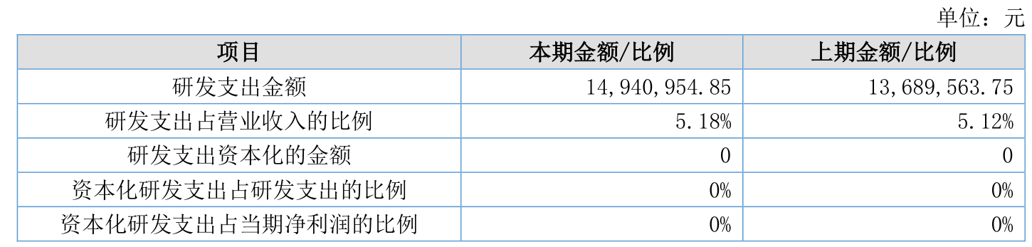 2025年全年,公司研发投入金额为1494.1万元,同比增长9.14%;研发投入占营业收入比例为5.18%,相比上年同期上升0.06个百分点。此外,公司全年研发投入资本化率为0%。