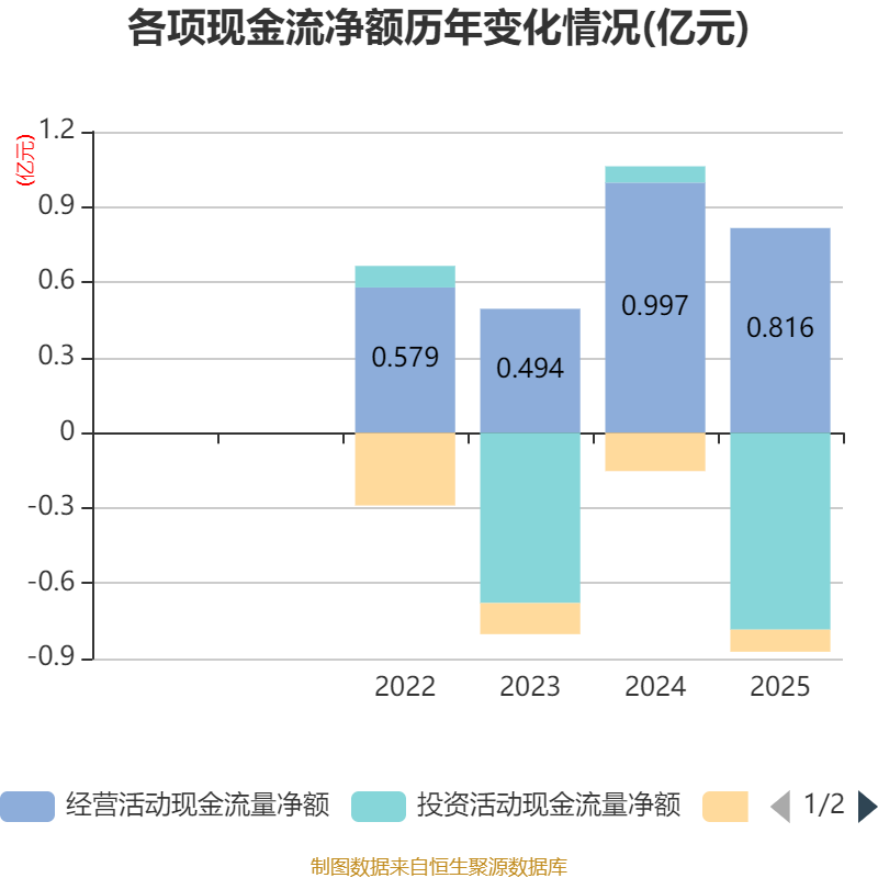 截至2025年,公司经营活动现金流净额为8156.81万元,同比下降18.17%;筹资活动现金流净额-884.77万元,同比增加647.41万元;投资活动现金流净额-7847.92万元,上年同期为648.31万元。