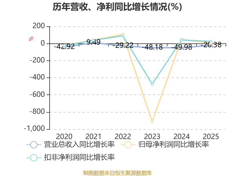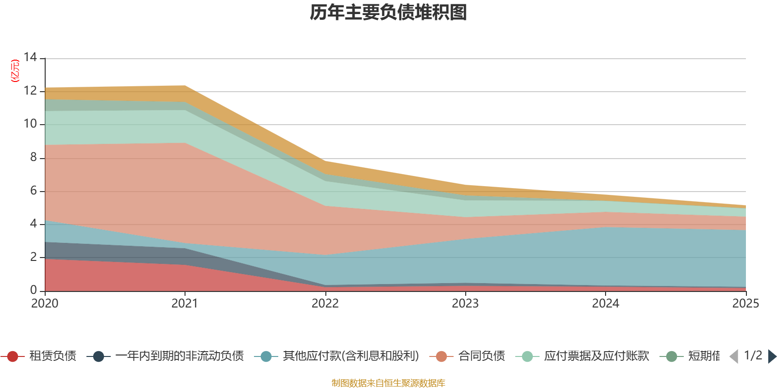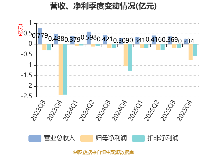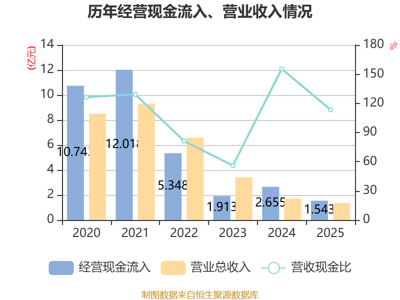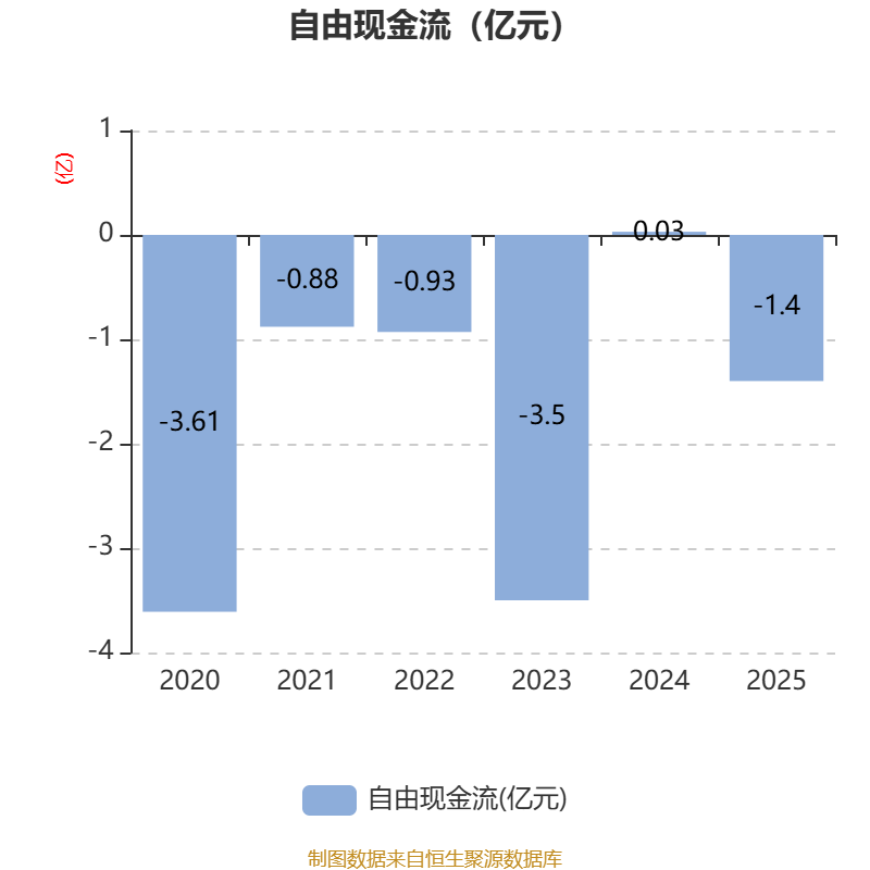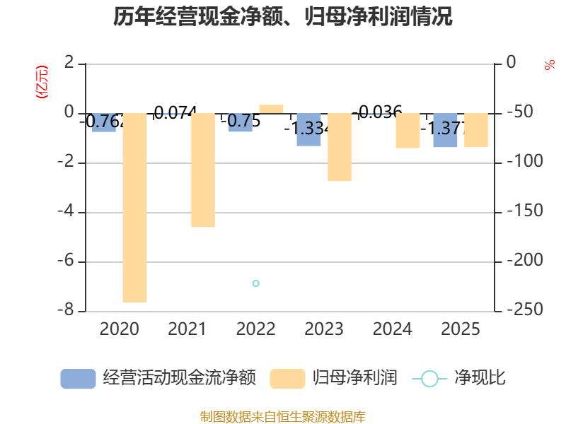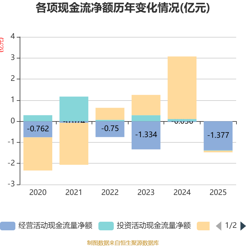 截至2025年,公司经营活动现金流净额为-1.38亿元,同比减少1.34亿元;筹资活动现金流净额-791.41万元,同比减少3.05亿元;投资活动现金流净额-183.85万元,上年同期为1047.02万元。