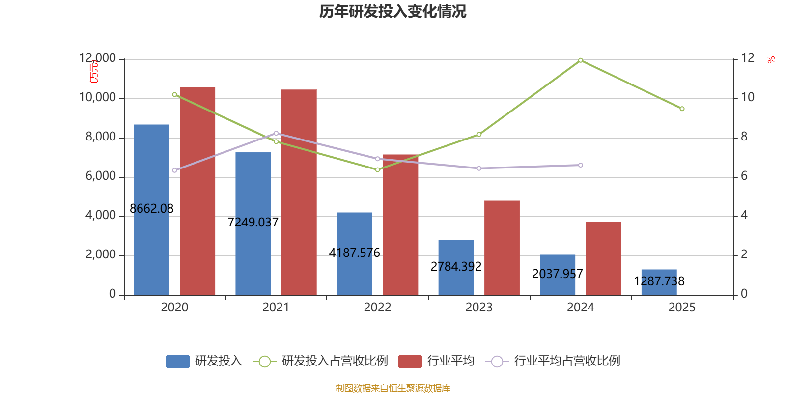 2025年全年,公司研发投入金额为1287.74万元,同比下降36.81%;研发投入占营业收入比例为9.47%,相比上年同期下降2.46个百分点。此外,公司全年研发投入资本化率为39.91%。