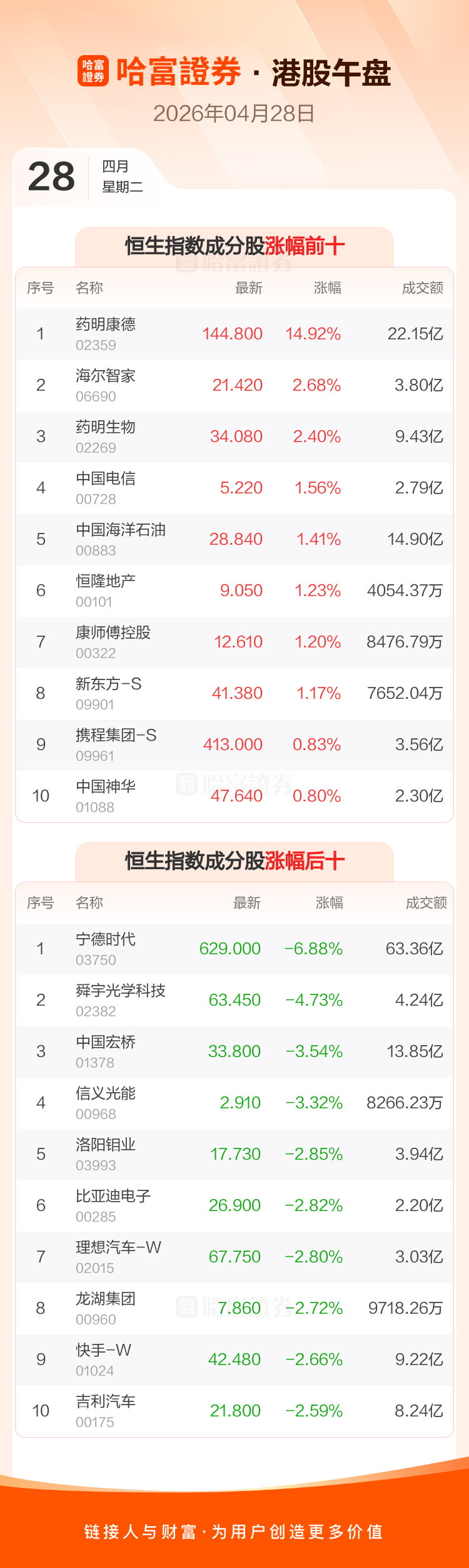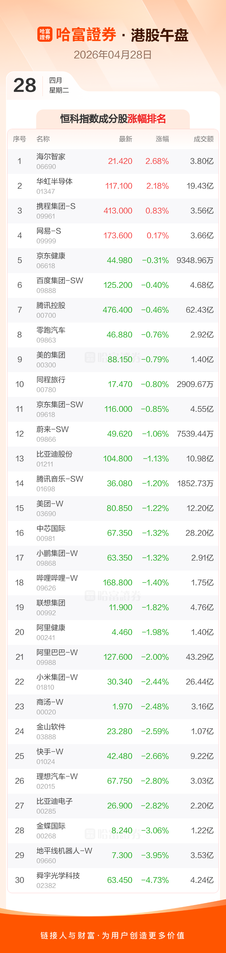 港股4月28日午盘走低,恒生指数收报25752.6点,跌173.05点,跌幅0.67%;恒生科技指数收报4879.0点,跌60.84点,跌幅1.23%。恒生指数成分股中药明康德、海尔智家、药明生物涨幅居前,宁德时代、舜宇光学科技、中国宏桥跌幅靠前。恒生科技指数成分股中海尔智家、华虹半导体、携程集团-S涨幅居前,舜宇光学科技、地平线机器人-W、金蝶国际跌幅靠前。
