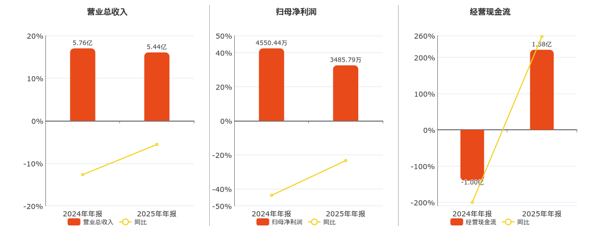 公司营业总收入为5.44亿元,在已披露的同业公司中排名第50,较去年同报告期营业总收入减少3212.54万元,同比较去年同期下降5.57%。归母净利润为3485.79万元,在已披露的同业公司中排名第42,较去年同报告期归母净利润减少1064.66万元,同比较去年同期下降23.40%。经营活动现金净流入为1.58亿元。