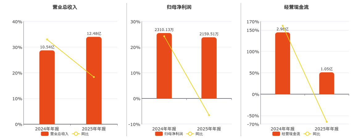 公司营业总收入为12.48亿元,在已披露的同业公司中排名第19。归母净利润为2159.51万元,较去年同报告期归母净利润减少150.61万元,同比较去年同期下降6.52%。经营活动现金净流入为1.05亿元,在已披露的同业公司中排名第20,较去年同报告期经营活动现金净流入减少1.92亿元,同比较去年同期下降64.61%。