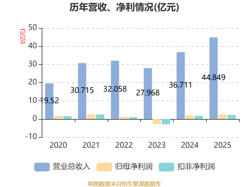 中证智能财讯长虹能源(920239)4月27日披露2025年年度报告。2025年,公司实现营业总收入44.85亿元,同比增长22.17%;归母净利润2.5亿元,同比增长26.54%;扣非净利润2.24亿元,同比增长27.03%;经营活动产生的现金流量净额为6.47亿元,同比增长82.86%;报告期内,长虹能源基本每股收益为1.37元,加权平均净资产收益率为25.11%。公司2025年度分配预案为:拟向全体股东每10股派现4元(含税)。