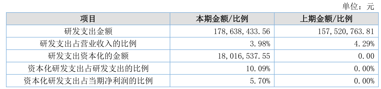 2025年全年,公司研发投入金额为1.79亿元,同比增长13.41%;研发投入占营业收入比例为3.98%,相比上年同期下降0.31个百分点。此外,公司全年研发投入资本化率为10.09%。