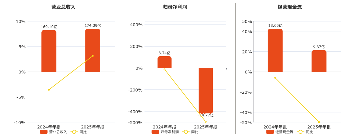 公司营业总收入为174.39亿元。归母净利润为-14.77亿元,在已披露的同业公司中排名第79,较去年同报告期归母净利润减少18.51亿元,同比较去年同期下降495.21%。经营活动现金净流入为9.37亿元,较去年同报告期经营活动现金净流入减少9.28亿元,同比较去年同期下降49.76%。