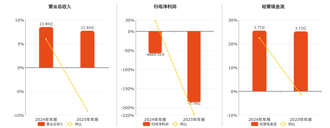 公司营业总收入为21.64亿元,在已披露的同业公司中排名第44,较去年同报告期营业总收入减少2.16亿元,同比较去年同期下降9.08%。归母净利润为-2.76亿元,在已披露的同业公司中排名第50,较去年同报告期归母净利润减少1.89亿元。经营活动现金净流入为3.72亿元,在已披露的同业公司中排名第32,较去年同报告期经营活动现金净流入减少467.26万元,同比较去年同期下降1.24%。