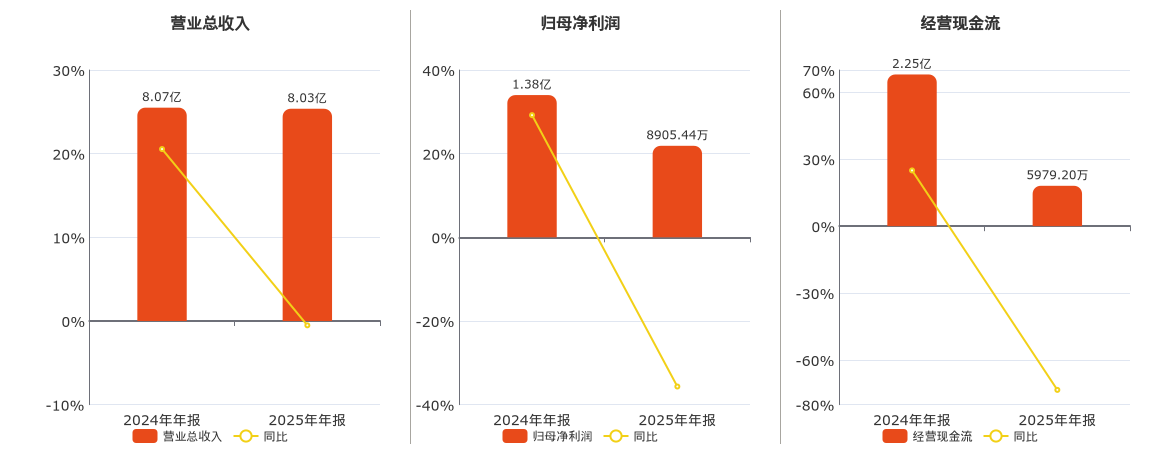 公司营业总收入为8.03亿元,在已披露的同业公司中排名第90,较去年同报告期营业总收入减少419.95万元,同比较去年同期下降0.52%。归母净利润为8905.44万元,在已披露的同业公司中排名第64,较去年同报告期归母净利润减少4937.05万元,同比较去年同期下降35.67%。经营活动现金净流入为5979.20万元,在已披露的同业公司中排名第84,较去年同报告期经营活动现金净流入减少1.65亿元,同比较去年同期下降73.39%。