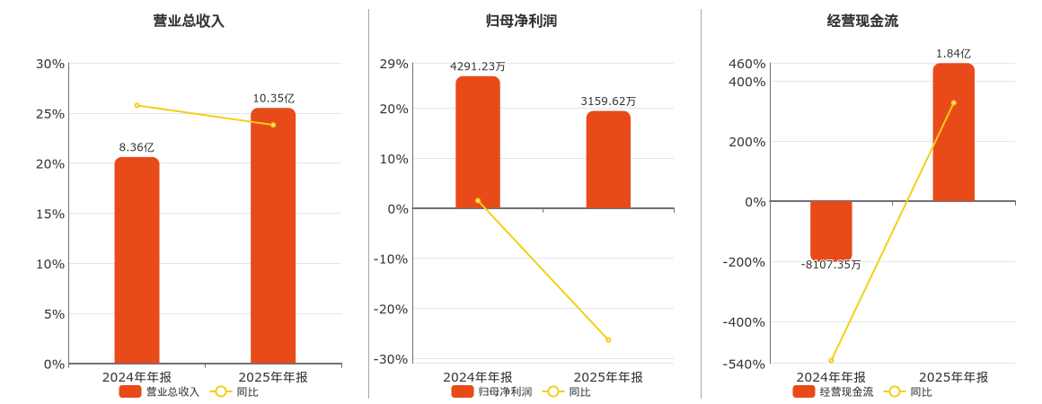 公司营业总收入为10.35亿元。归母净利润为3159.62万元,较去年同报告期归母净利润减少1131.62万元,同比较去年同期下降26.37%。经营活动现金净流入为1.84亿元。