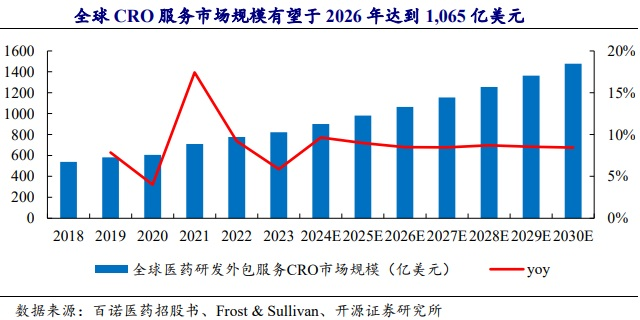 开源证券表示,全球CRO市场规模呈现出持续增长态势,并由2018年的539.1亿美元增长到2023年的821.1亿美元,年复合增长率为8.8%。根据 Frost&Sullivan 的统计和预测,全球CRO服务市场规模将持续扩大,2026年达到1065亿美元,2023年至2026年的复合年增长率为9.0%,并在2030年超过1477亿美元。