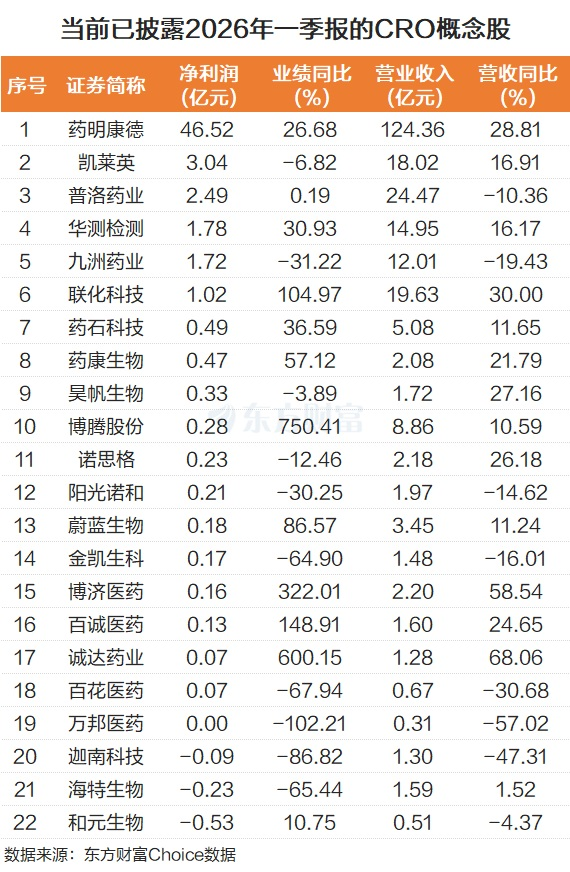 整个CRO概念板块来看,东方财富Choice数据显示,当前已有22股披露了2026年一季报,合计实现归母净利润58.5亿元,较2025年一季报的48.23亿元,同比增长21.29%。