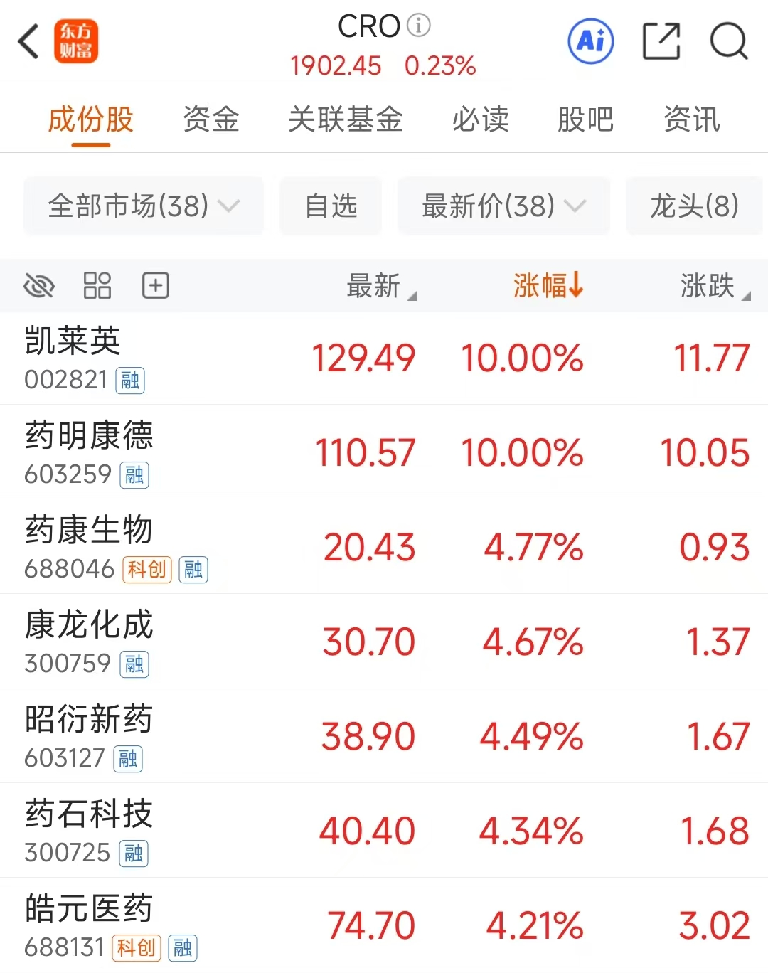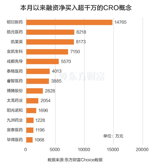 本月以来,杠杆资金已在积极抢筹CRO概念。昭衍新药被融资净买入1.48亿元;皓元医药、凯莱英、金凯生科、成都先导被融资净买入超5000万元。整体而言,东方财富Choice数据显示,CRO概念中有13股被融资净买入超千万。