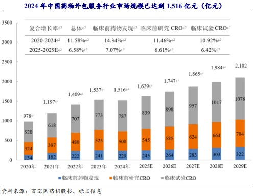 近年来,中国CRO行业快速发展,根据标点信息数据,2024年中国药物外包服务行业市场规模已达到1516亿元人民币,2020年至2024年的年均增速达到11.58%。医药研发投入不断增长,新型疗法兴起,加之市场国际化发展,为中国CRO产业发展提供充足的市场空间。预计2025年至2029年,我国CRO市场规模仍将以 6.58%的速度增长,预计在2029年将达到2102亿元左右。