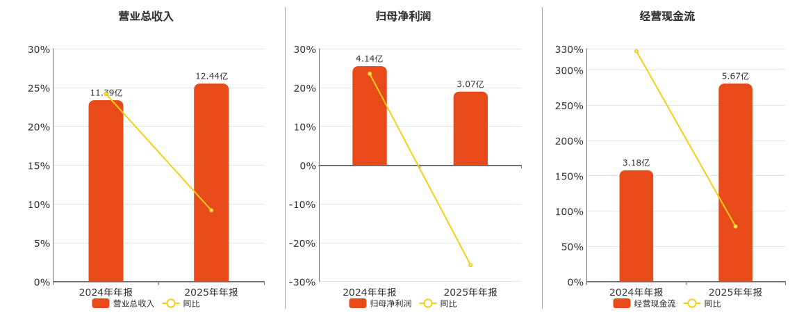 公司营业总收入为12.44亿元,在已披露的同业公司中排名第24。归母净利润为3.07亿元,较去年同报告期归母净利润减少1.07亿元,同比较去年同期下降25.78%。经营活动现金净流入为5.67亿元。